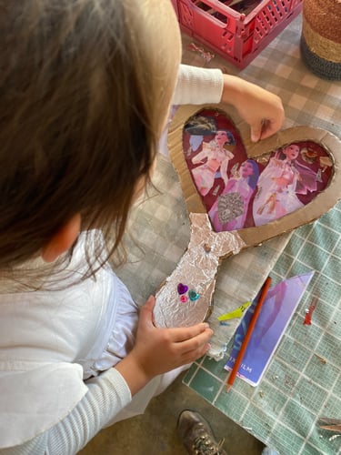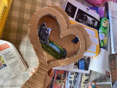 Já com a imagem tema escolhida, passámos para a escolha do formato do nosso espelho. Eu escolhi uma simples oval, mas as nossas artistas decidiram fazer os seus espelhos em forma de coração. Muito femininas estas nossas artistas! Adoro. Depois foi folhear as revistas que tínhamos aqui no atelier para escolher que imagens ou mensagens nos inspiravam a viver esta nossa missão de sonhar e que podíamos incorporar na nossa composição. Houve quem tendesse mais para o uso de imagens da natureza, demonstrando que o seu sonho e missão é que saibamos proteger este mundo onde vivemos, e quem fosse mais aliciada para imagens de beleza e brilho, usando joias na composição, representando assim a missão de estar atenta e chamar a atenção para a beleza das coisas.
