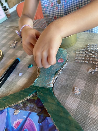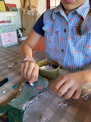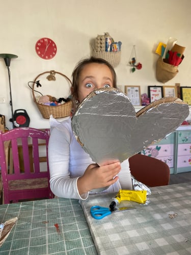 Depois de compor os recortes foi altura de embelezar o nosso espelho com cor e papel prata. Perdemos a cabeça na utilização deste material deixando o nosso atelier cheio de brilhos refletidos pelo papel de prata presente no nosso espelho de cartão, espalhando luz por todo o atelier. Em seguida, colocámos um acrílico transparente no espaço aberto do espelho de modo a protegermos a nossa composição, mas para também, dependendo da incidência da luz, ser um elemento refletor. Por fim, decorámos a moldura do espelho com autocolantes coloridos e em forma de diamante et voilá!