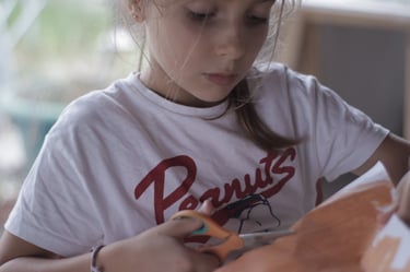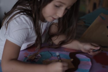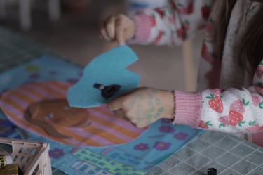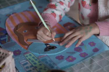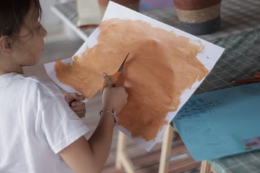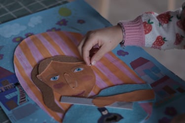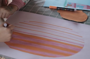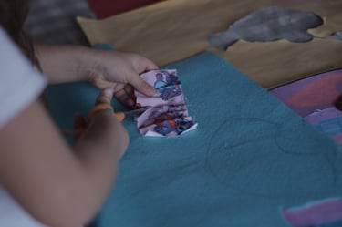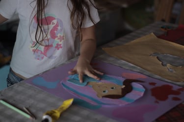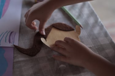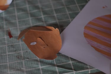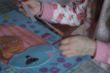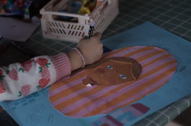 Quando a tinta da folha A3 já estava seca, recortámos o formato da cabeça e também o nariz e os olhos. Os outros elementos do rosto desenhámos com canetas. Para o cabelo e roupa os nossos artistas usaram feltro que alguns conciliaram com recortes de tecido com personagens de filmes que encontraram no cesto de retalhos do atelier.