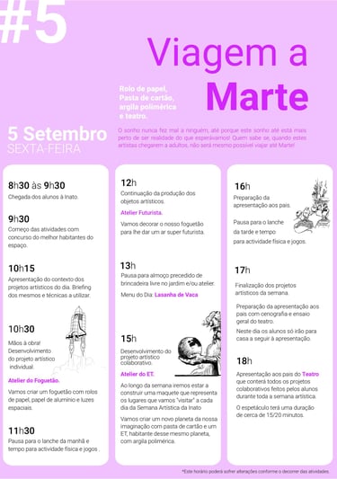 No último dia, para além do projecto de ir a Marte nos foguetões feitos por nós e do concurso de melhor alien/astronauta, foi um dia muito dedicado à apresentação aos pais que iríamos fazer no final desse dia. Todos os dias tínhamos um tempo para ensaios mas neste último dia, em que já tínhamos todas as personagens atribuídas a cada uma das nossas artistas que envergavam já, orgulhosas, as suas condecorações, trabalhámos mais afincadamente no teatro. É que queríamos mesmo deixar os pais orgulhosos!